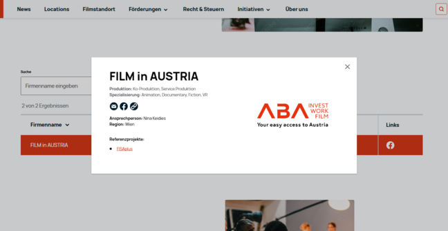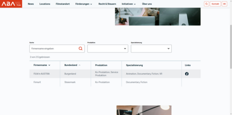Die nationale Film Commission FILM in AUSTRIA hat gemeinsam mit dem Fachverband Film & MusikFachverband Film & Musik (wird in einer neuen Registerkarte geöffnet) die Plattform „Austrian producers“ entwickelt, auf der sich österreichische Produktionsfirmen und Produktionsdienstleistungsunternehmen registrieren können.